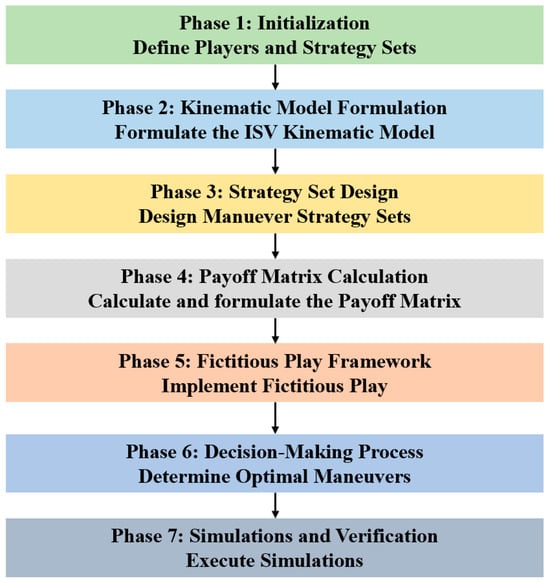 The application of ZSGs to target pursuit manifests as zero-sum pursuit–evasion games (ZSPEG). The ZSPEG-based model comprises two players: the pursuer and the evader [16,17,18,19]. In refining the ZSPEG-based model to be more specific and tailored, researchers focus on enriching its objective function and considering various involved factors. A divide-and-conquer approach is used for a multi-player ZSPEG where the pursuers have a twofold goal [11]. To identify unknown sets of incoming attackers, a multi-model adaptive estimator is implemented in the offline design policy sets [24]. Furthermore, a bilateral adaptive parameter estimation method is adopted to deal with a multi-agent ZSPEG model with unknown general quadratic goals [25]. In recent years, various algorithms have been developed to solve ZSG-based models, such as regret matching [26], fictitious play [27], double oracle [28], etc. Among them, the most popular algorithms are regret learning-based methods. They rely on the concepts of external regret, internal regret, swap regret, and Nash equilibrium-based regret [29]. Building on this foundation, the current mainstream algorithms are the optimistic follow-the-regularized-leader [30] and the optimistic mirror descent algorithm [31]. Despite the extensive research on ZSPEG-based methods and the relevant algorithms, there is little research on applying the ZSPEG to multi-ISV target pursuit. The main reason for this is the high complexity, data scarcity, and many technical challenges in multi-ISV target pursuit. In this context, comparing other algorithms to the ZSG-based models, the fictitious play algorithm can provide more effective assistance. Firstly, fictitious play could simulate the behavior of the target, which could help the pursuit system to better understand the behavioral patterns of the target, thereby addressing the data scarcity of the target. Additionally, the fictitious play algorithm allows for the experiment to be validated and for an easier evaluation of the feasibility of different strategies and algorithms. This characteristic could prove advantageous for multi-ISV systems by mitigating the complexity during the surface pursuit. Thus, fictitious play is adopted as the solution framework for our developed ZSPEG-based, multi-ISV, target-pursuit model.