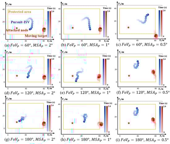 To generate and analyze the trajectories under the single-ISV pursuit model, the initial position for the moving target is set to along the boundary of the protected area. The position of the unknown attacked node should be within the protected area. Thus, it is assumed that = (80,5), = (20,10), = (40,22), , and . After being solved by Algorithm 2, under different and configurations, nine trajectories in the single-ISV pursuit are shown in Figure 4. Although the rational motions were sequentially generated for the ISV in time, the vehicle fails to capture the target in all the situations. If the ISV does not fulfil the necessary conditions, the target could gain the initiative to attack its intended node. Therefore, it is an inevitable trend that multi-ISV pursuit replaces single-ISV pursuit.