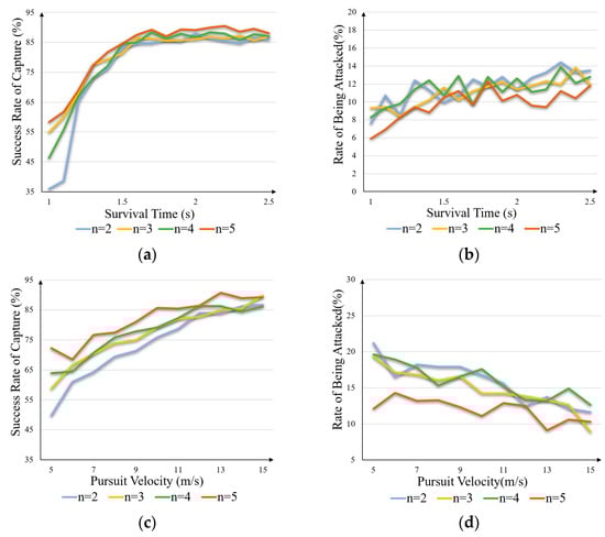 Analysis of n, , and : To explore the impact of variables on the performance, simulations are conducted using different numbers of vehicles , various survival times , and changing pursuit velocities . The results are shown in Figure 5. In Figure 5a, once exceeds 1.6 s, all the success rates would be stable, with a small fluctuation of around 85%. As shown in Figure 5b, there were no significant differences or changes among the data. The rates of attack were all below 15%. The above observations indicate that when the survival time exceeds a certain value, further increasing no longer contributes to improvements in the performance. According to the results shown in Figure 5c,d, with the pursuit velocity increases, the capture success rate in all the teams increases, while the rates of the node being attacked all decrease. To obtain a higher success rate and a lower rate of being attacked in a pursuit team, improving the pursuit velocity could be helpful. Furthermore, the team with always achieves the best pursuit performance due to its having the highest number of vehicles. In sum, the variation in the team-scale and the pursuit velocity has a more significant impact on the model’s performance compared to the changes in time. Therefore, during the optimization of the system, particular attention should be paid to the and adjustments.