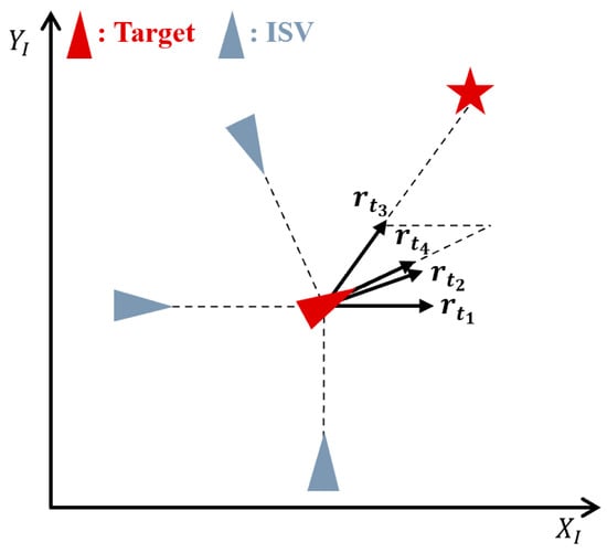 (collective evasion strategy). From the perspective of the target, all angles formed between the two adjacent ISVs are taken into account in the collective evasion strategy. Additionally, the moving direction of the target is the parallelogram of the maximum angle formed by the two adjacent ISVs. The purpose of this strategy is to enable the target to move immediately away from the entire pursuit team, rather than just from one ISV. The calculation for this evasion motion is as follows: Firstly, is set to represent the angle of the vector (). denotes the angle between two adjacent ISVs. If , is equal to . Therefore, could be obtained by Equation (35).