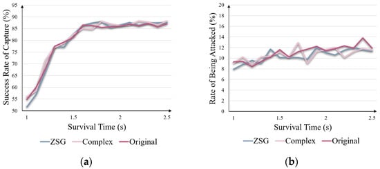 With changing survival times, simulations were carried out under , and , respectively. The results are shown in Figure 7. In terms of the success rate of capture and the rate of being attacked, it is apparent that there is no significant difference among the three strategy sets. This discovery underscores the robustness of our proposed method, showcasing its ability to maintain a consistent performance despite variations in the target’s strategy set.