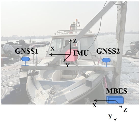 The relative positions of Inertial Navigation System (INS) and Multibeam echo sounder (MBES), and their respective reference coordinate systems.