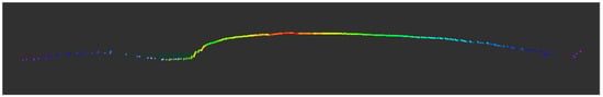 The bottom detection data within the swath packets represent the measurement results of the underwater environment by the MBES. These data can be transformed into point cloud data through the mapping of a three-dimensional matrix. The resulting point cloud data are analogous to the data from a single-line Light Detection and Ranging (LIDAR) point cloud with a fixed angle and no rotational scanning capability (Figure 6). Due to the minimal overlap between adjacent swaths and the weak association between them, frame-to-frame matching is not feasible [31]. Consequently, the direct use of the raw point cloud data from MBES for mapping does not achieve the high-precision odometry typically found in multi-line LIDAR mapping [32]. In this study, we employ the iEKF to reduce estimation errors and more accurately approach the true state of the MBES system. Furthermore, we have considered the application of the GICP algorithm for post-processing optimization to refine the point cloud data.