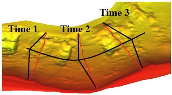 MBES mapping involves integrating point cloud data with navigation information, as depicted in Figure 7. Here, the red lines represent the projection of the point cloud onto the seabed, while the black arcs depict the platform’s trajectory during motion. The resulting point cloud map consists of multiple such point clouds combined with dynamic movements. Accurate motion estimation is critical in this process.