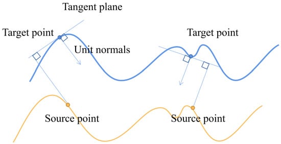 The objective function is solved using an unconstrained non-optimization method from the Point Cloud Library (PCL) to determine the optimal values for the transformation matrix . GICP analyzes the local properties of each pair of original points and target points to adjust the weights of the generated distance residuals. This weight is represented by the coefficient in the quadratic form concerning distance. When is an identity matrix, GICP degenerates to the most common point-to-point registration. In the case where all points in are closest to the corresponding tangent plane of the target point , GICP performs point-to-plane matching (Figure 8).