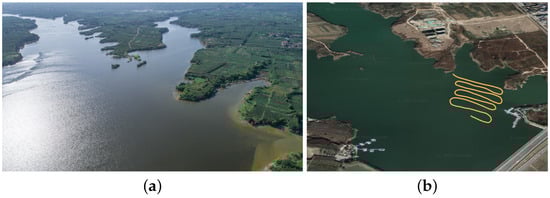 To validate the practicality and reliability of our approach, we conducted field experiments at Li Quan Lake (Xi’an, Shaanxi Province, China). The experimental environment is geographically located at 34°31′29″ N, 108°25′31″ E, with the test area measuring approximately 350 × 200 m. The vessel moved along a serpentine route, with an overlap rate between adjacent survey lines ranging from 30% to 50%, as shown in Figure 9. The water depth near the shore averages approximately 8 m, while the depth at the lake’s center reaches about 12 m. The experimental vessel maintained an average speed of 2 knots throughout the survey.