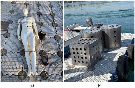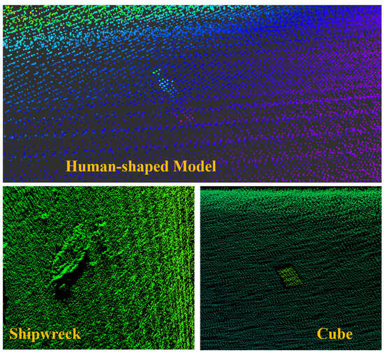 To verify the accuracy of the map construction and to prepare datasets for future underwater target detection tasks, we have fabricated cylindrical, cubic, and human-shaped models as bottom targets. Examples of these models are illustrated in Figure 10. During target deployment, utilize the mobile phone’s built-in GPS to record the latitude and longitude coordinates of the deployment site. This will ensure accurate matching and comparison of the collected target point cloud data with the actual geographical location.
