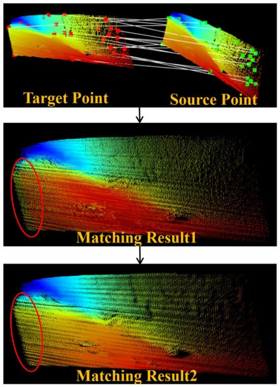 Figure 14 illustrates the detailed process of registering a subset of point cloud data, which includes feature extraction, the computation of feature correspondences, coarse matching, and subsequent refinement using the GICP algorithm. Initially, random transformations and Gaussian noise are applied to the loaded point cloud map to simulate real-world scenarios. Key features are then identified within the input point cloud using the Harris Corner Detector, and correspondences between these key points are computed. A coarse matching of the point clouds is performed using the estimated rigid transformation. To enhance registration accuracy, the GICP algorithm is employed for a refined matching phase, effectively managing nonlinear transformations and achieving the precise alignment of the point cloud data despite significant noise interference. The experiment indicates that the average registration error of the algorithm is 0.97 m. Furthermore, Figure 15 depicts a scenario with more distinct features, where the average registration error is further reduced.