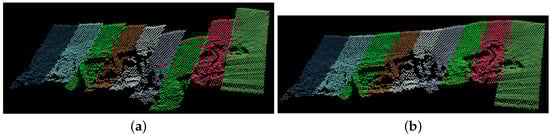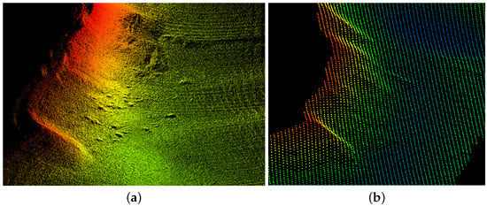 The algorithm proposed in this study (left), and the other produced by the HydroMaster (right). Both images are the result of scanning the same terrain at different times. The advantage of our method lies in its ability to export point cloud files with greater information content, preserving more detailed features. In contrast, the point cloud data exported by the HydroMaster software may lose some details due to the sampling process. The data can be accessed at http://www.hydroshare.org/resource/3592c1d35fdb4f29a1416e2c6099e13b (accessed on 6 July 2024). (a) Our method; (b) HydroMaster.