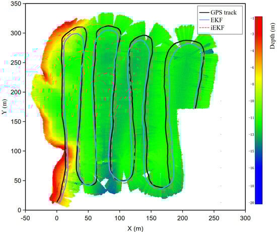 Figure 17 illustrates the analysis of the trajectory estimation error. During the experiment, the vessel traveled approximately 1700 m in total, with the GPS-provided values serving as the ground truth. Absolute Trajectory Error (ATE) is commonly used as a metric to evaluate mapping quality in SLAM applications. This metric was first proposed by [40], and in [9,41] it has been utilized to assess MBES mapping performance. The authors of [9] compare ATE values for MBES mapping using three different algorithms, showing a maximum ATE of up to 90 m. Our results indicate that the iEKF method achieved an ATE of 15.10 m, whereas the EKF method resulted in an ATE of 16.91 m, which demonstrates the effectiveness of our approach. Throughout the experiment, errors were notably larger during turns and relatively smaller during straight-line travel. The experimental results are shown in Table 7, where “Location error of human-shaped model” and “Location error of cube” are derived from the difference between the scanned locations and the actual locations of the targets. A comparative analysis indicates that our approach has significantly enhanced the reliability and accuracy of map construction. Furthermore, the application of the GICP algorithm for point cloud registration has resulted in a reduction of the ATE by 9.0%.