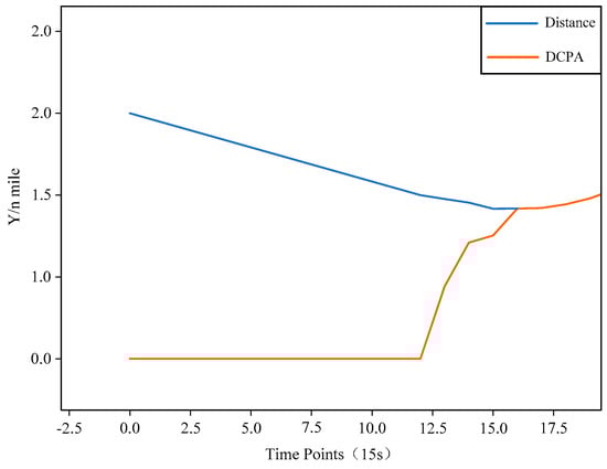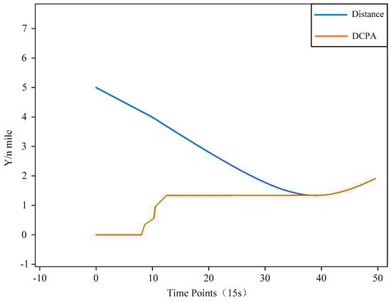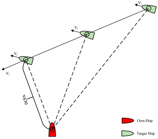 Modern navigation systems frequently possess the capacity to automatically calculate and monitor TCPA and DCPA, effectively integrating existing technical systems and applying them to real-time navigation [52,53]. The information is then analysed to determine the potential for collision between the ships, and appropriate avoidance actions are implemented in response. DCPA and TCPA are employed to quantify the collision hazard in both the spatial and temporal dimensions, respectively, while the ship is underway. In the event that both the DCPA and TCPA fall below a specified threshold, it is deemed that a collision is imminent. In such a scenario, the ship should steer or change speed to avoid a collision in accordance with the principles of ‘early, large, wide and clear’ as outlined in the COLREGs.