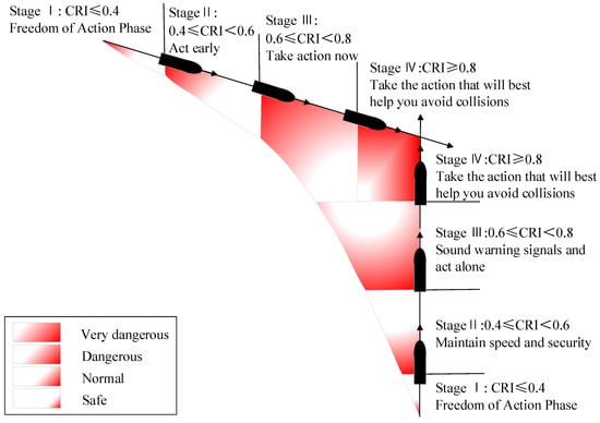 The value of CRI is within the range of [0, 1], with the lower limit of the interval representing the absence of danger of collision, and the upper limit representing the inevitability of collision. Different CRI values represent varying degrees of collision danger, and the actions required by the ship are also different. See Table 1 for details. When CRI ≤ 0.4, both ships are in the free action phase. When 0.4 ≤ CRI < 0.6, the vessel on the right should take action as soon as possible. When the collision danger reaches 0.6, the vessel on the right should take action immediately, as failure to do so may result in the vessel on the left taking action alone. When the collision danger reaches 0.8, the two vessels should take the action that is most helpful for collision avoidance, as shown in Table 1. The cross-encounter posture of two ships is used as an illustrative example in Figure 2, which depicts the ship’s actions under different collision hazards.