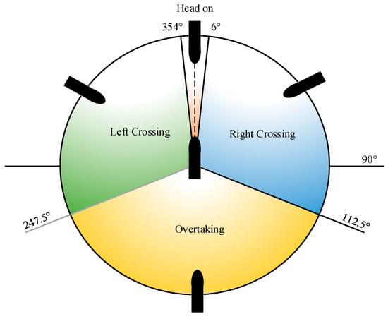In accordance with COLREGs, the encounter situation between two ships can be classified into three categories: head-on, overtaking, and crossing situation. These categories are illustrated in Figure 3. The relevant provisions for ships in these encounter situations are outlined in Table 2.