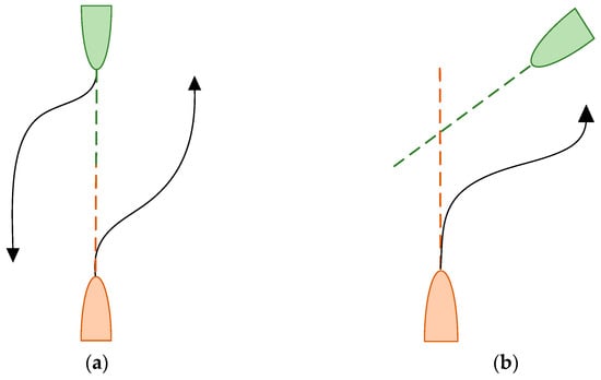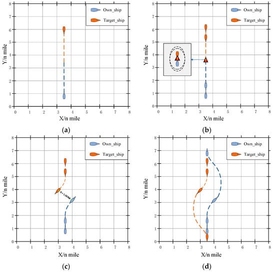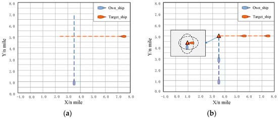 Figure 10 presents a schematic diagram of the posture of the two ships at the critical node in the head-on situation. The blue line indicates the trajectory of the own ship, while the orange line indicates the trajectory of the target ship. Figure 10a depicts the initial position of the two ships, demonstrating that there is no imminent danger of collision. However, should the two ships continue to adhere to their original sailing plan, the distance between them will gradually diminish, eventually leading to a pair encounter situation until a collision accident occurs. Upon reaching the (3.5, 1.5) coordinate position, the own ship encounters the target ship at the (3.5, 5.5) coordinate position, thereby forming a head-on situation. At this juncture, the DCPA and TCPA of the two ships reach the threshold of taking avoidance action, as depicted in Figure 10b.