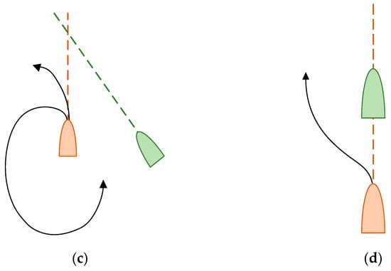 Collision avoidance obligations of MASS in head-on, overtaking, and crossing situations. (a) Head-on situation, (b) small-angle crossing situation, (c) large-angle crossing situations, and (d) overtaking situation.