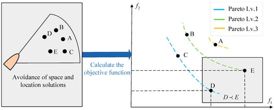 In the context of a certain collision avoidance scheme Xi within the MASS collision avoidance process, whose objective function is (fi1, fi2), if another collision avoidance scheme Xj = (fj1, fj2) that satisfies the following conditions: {fj1 ≤ fi1,fj2 ≤ fi2} and {fj < fi1 or fj2 < fi2}, then Xi is said to dominate Xj (denoted as ). For the sake of argument, consider five avoidance schemes, A, B, C, D, and E. According to the definition of domination, there are two sets of domination relations, namely {(C A, B)} and {(D A, E)}, as illustrated in Figure 5. According to the Pareto ordering mechanism, points C and D are assigned to the ParetoLv.1 stratification because they have no dominated elements. The curve where the set of solutions of Lv.1 is located is called the Pareto frontier curve. There is no superiority or inferiority of the points on the Pareto frontier; rather, they are simply evaluated differently. The function value of f1 for the C solution is the smallest, while the function value of f2 for the C solution is the largest among all solutions under the same stratification. The curve representing the Pareto frontier is defined as the Pareto frontier curve. Consequently, the evaluation of avoidance solutions may vary according to the specific requirements.