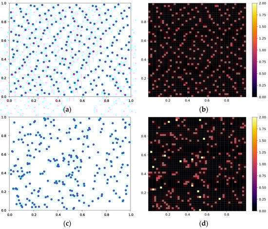 Initial population generated by the good point set and randomly. (a) Good points set, (b) good points set density, (c) randomly, and (d) randomly density.