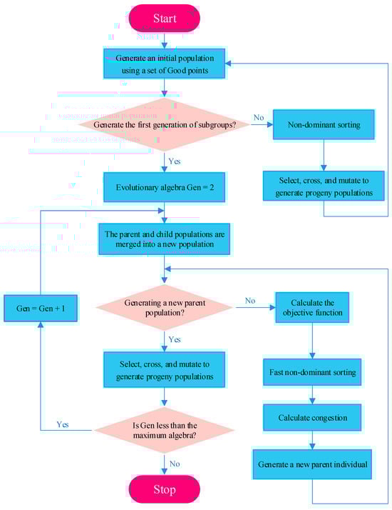 Following optimisation of the NSGA-II algorithm population using the good point set, the algorithm exhibits a reduction in the number of iterations and a more uniform distribution of solutions. This is beneficial for the algorithm to explore the solution space more extensively at an early stage, compared with a randomly generated population. The process of GPS-NSGA-II algorithm is illustrated in Figure 7.
