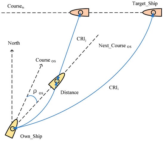 where CRIi represents the collision risk between the two ships in the absence of collision avoidance measures. The relevant calculation is based on Equation (12), while CRIj denotes the collision risk between the two ships following the implementation of collision avoidance measures. The difference in collision risk before and after the collision avoidance measures are employed serves to indicate the impact of the aforementioned measures. If the value is negative, it indicates that the collision risk between the ships after taking collision avoidance action has decreased, thereby demonstrating the effectiveness of the collision avoidance action taken.