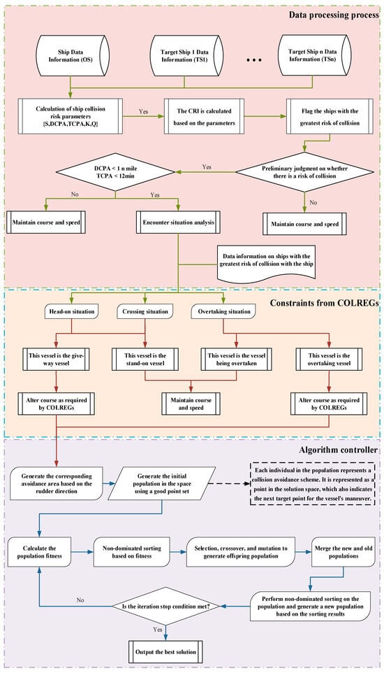 The integration of cutting-edge technologies, including artificial intelligence, big data, communications, and the Internet of Things, with traditional ships has led to the emergence of MASS, a technology that revolutionises the conventional ship navigation model. MASS controls the ship’s navigation process through advanced sensors and machine learning algorithms, which enable the navigation of ships in a more efficient and safer manner [1,2,3]. Currently, MASS is still in the experimental phase, and its full implementation is constrained by several challenges. One such challenge is the development of an autonomous system capable of avoiding collisions with other vessels in the complex maritime environment [4]. The issue of autonomous collision avoidance among ships is not only concerned with intelligent collision avoidance path planning, but also needs to comply with the relevant provisions of COLREGs [5,6]. COLREGs are universally recognised and commonly adhered to maritime navigation rules, and also form a supporting document for the MASS autonomous navigation decision-making system. Only by incorporating the relevant provisions of the COLREGs into the design of the MASS autonomous collision avoidance system can a safe and effective autonomous collision avoidance decision-making system be constructed [7,8].