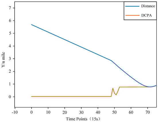 The alterations in the distance between the vessels and the DCPA throughout the collision avoidance procedure between the two vessels in a head-on configuration are depicted in Figure 11.