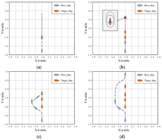 In accordance with COLREGs Article 14, each of the two ships turns to the right. Once the two ships have initiated collision avoidance manoeuvers, the own ship successfully avoids the target ship at t = 675 s. At this point, the distance between the two ships is 1.39 n mile, as shown in Figure 10c. Subsequently, the efficacy of the avoidance action is validated, and the original route is resumed in accordance with the requirements of the COLREGs, as shown in Figure 10d.