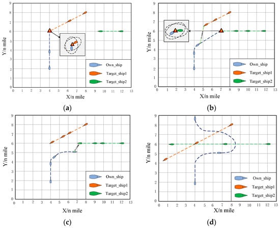 Key scenario diagrams of the collision avoidance process for the muti-ship situation. (a) Initial situation, (b) successful avoidance of target_ship1, (b) successful avoidance of target_ship2, and (d) resume to original route.