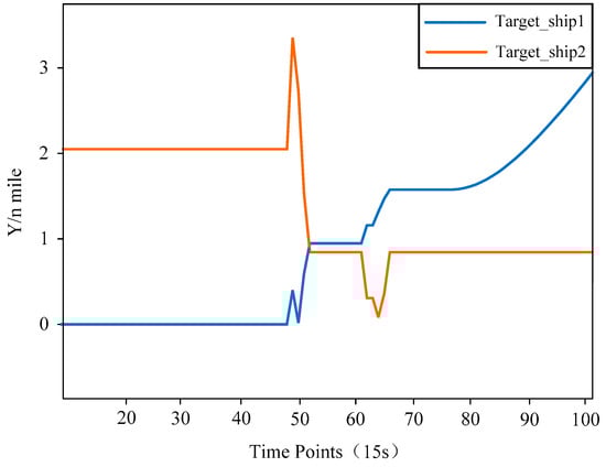 In the multi-ship encounter experiment, the blue line represents the trajectory of the own ship, the orange line indicates the trajectory of target_ship1, and the green line indicates the trajectory of target_ship2, as shown in Figure 16a. The own ship first forms a collision risk with target_ship1, and the two ships will collide if they continue to follow the original route. Upon reaching (4, 4), target ship No. 1 proceeded to (6, 7), at which point the DCPA and TCPA of the two ships reached the threshold for avoidance action. This resulted in the formation of a crossing situation, in accordance with the requirements of the COLREGs. The own ship was required to alter course to starboard, while target_ship1 was instructed to keep her course and speed. As illustrated in Figure 16b, at t = 870 s, the own ship successfully avoided target_ship1, and at this time, the distance between the two ships was 2.63 n mile. The own ship continues sailing and has a risk of collision with target_ship2. At this time, the two ships form a crossing situation. In accordance with the requirements of the COLREGs, the own ship will alter its course to starboard, as shown in Figure 16c. At t = 1365s, own ship successfully avoids target_ship2 at a distance of 1.28 nm. Once the collision avoidance procedure has been completed, own ship will gradually turn and resume its original route, as illustrated in Figure 16d. The statistics of DCPA parameters between the own ship and the target ships during the collision avoidance in the multi-ship situation are presented in Figure 17.