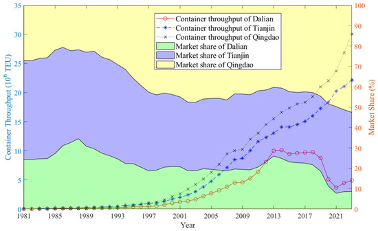The data used in this paper (see Figure 2), the container throughput for 1990–2018, was mainly obtained from the China Port Yearbook; that of 2019–2023 was obtained from public information on the website of the Chinese Ministry of Transport. The authors compile data for 1981–1989 from various sources. Figure 2 shows the traffic evolution of the Bohai Rim ports during the period of 1981–2023. We find that the container throughput of Qingdao Port and Tianjin Port represents sustainable growth. The market share of Qingdao Port began to surpass that of Tianjin in 1997, while the decline of Dalian Port is obvious. Container throughput has not exceeded 10 million TEU since the first negative growth in 2015.