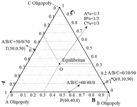 The points in a ternary diagram that are located at angles, sides, and barycenters have special meanings. The coordinates of the three corners in the ternary diagram are (0, 0, 1), (1, 0, 0), and (0, 1, 0), which means that the point is composed of only one component, that is, the market of the multi-port system is completely monopolized by port A, port B, or port C (see Figure 4).