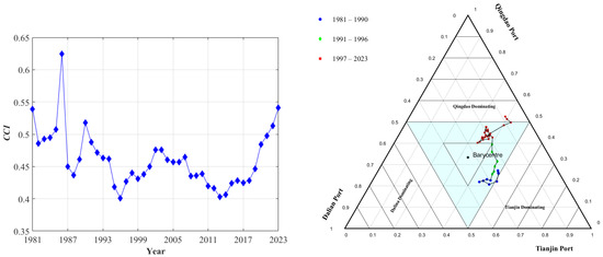 Figure 5(left) shows that the CCI of the Bohai Rim terminal system has steadily declined from 0.486 to 0.401 between 1981 and 1996, indicating that the market moved from having an absolute advantage in ports to a loss in core key ports. After a period of stable increase from 1996 to 2003, the CCI gradually declined from below 0.403. Since 2013, the CCI value has been rapidly approaching the value of 0.544 in 2023, indicating that the development trend of a certain port that is on the verge of having an absolute advantage is becoming more and more obvious.