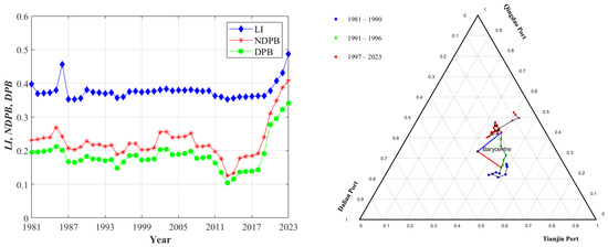 The LI, DPB, and NDPB (left) and the value of the DPB and NDPB in the ternary diagram (right) of the Bohai Rim multi-port system, 1981–2023.