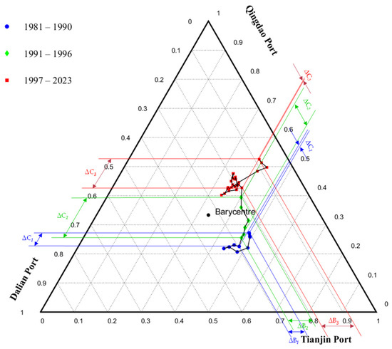 The above results have shown an evident evolution of the traffic composition in the Bohai Rim multi-port system. As exhibited in Section 3.1, although the change range of the MVCs is small, the MVCs of 1990 and 1997 in the Bohai Rim multi-port system were 0.46 and 0.43, respectively. The maximum market share was Tianjin Port and Qingdao Port in 1990 and 1997, which means that the leading ports of the Bohai Rim port group have changed. The years 1990 and 1997 can be regarded as two significant points in the ternary diagram (see Figure 5). Therefore, the evolution of the Bohai Rim multi-port system is divided into three stages: from 1981 to 1990, from 1991 to 1996, and from 1997 to 2023.