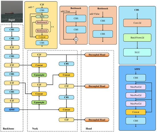In recent years, the importance of the attention mechanism in the field of target detection has increased. This mechanism improves the generalization ability of detection models by focusing attention on regions and features of interest. For example, Shang et al. [] proposed to improve the YOLOv5 algorithm by utilizing the convolutional block attention module (CBAM) and coordinate attention (CA), which improves the maritime target detection accuracy by assigning higher weights to the tensor regions where the target is more likely to appear. Although this method has been effective in improving the accuracy of ship detection, they have not proposed effective solutions when dealing with dense ship identification problems. In response, Wang et al. [] optimized the YOLOv5 model by combining the CNeB2 module and the separated and enhanced attention module (SEAM) attention mechanism, successfully solving the problem of difficult positioning when ships are dense. Zhao et al. [] significantly enhanced the model’s performance in detecting occlusion and targets of different scales by integrating the ECA module into YOLOX’s backbone network and improving non-maximum suppression. However, they did not provide targeted optimization to address recognition issues caused by rain, fog, and visual blurring. Si et al. [] first used the K-means method to improve the clustering performance of ship data and then introduced the squeeze-and-extraction (SE) mechanism in the feature extraction network to enhance the feature extraction ability. This innovation effectively improves the recognition performance of the model for ships under sea fog conditions, but no effective improvement measures have been proposed for the problem of shaking blur. Wang et al. [] proposed a feature fusion module incorporating a GT module, which effectively suppresses the noise introduced by shallow features, and introduced an SPD-Conv module in order to improve the detection accuracy of low-resolution images. This method has achieved significant results in improving the image resolution reduction caused by shaking, but it has limitations in processing visible light images required in this study, as it is mainly suitable for infrared image processing. Although the above target detection algorithms are able to achieve high-precision detection of ships in fixed surveillance environments, they fail to effectively deal with the problems of recognizing ships on shaky platforms and under complex environmental conditions at the buoy end at the same time. In view of this, this article proposes an improved YOLOv8 object detection algorithm aimed at effectively overcoming issues such as camera shake and rain and fog occlusion at the buoy end, thereby accurately identifying ship types at the buoy end. The following are this study’s primary contributions: