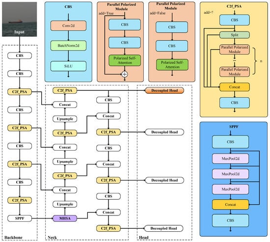 Firstly, in order to help the model accurately understand the spatial information of ships, this study embedded the polarized self-attention mechanism into the C2f module, thereby creating a new C2f_PSA module that can retain the high-resolution information in the original deep convolutional neural network through polarization filtering. Furthermore, in order to enhance the model’s ability to capture remote structural information from images and further optimize the effect of feature fusion, this paper introduces the MHSA mechanism into the neck network of YOLOv8, thereby not only improving the receptive field of the network but also significantly enhancing its feature expression capability. Finally, in order to further enhance the detection capability of small ships in complex environments, this paper first concatenates shallow and deep feature maps to obtain richer feature information and then adds smaller scale detection heads for detection. Figure 5 shows the YOLOv8-PMH network architecture proposed in this study, with improvements represented in color.