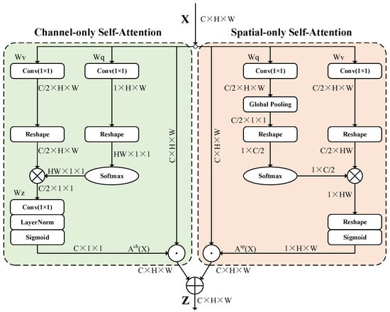 After the emergence of spatial and channel attention mechanisms, dual attention mechanisms that integrate these two dimensions have emerged to further improve the performance of models, such as DANet [] and CBAM []. Although these two attention mechanisms combine channel information and spatial information, they are sensitive to input noise. Therefore, a polarized self-attention (PSA) mechanism [] has been proposed for achieving high-quality pixel-by-pixel regression. Compared with existing channel spatial combination methods, PSA attention does not prefer specific layouts, thus demonstrating greater flexibility and adaptability. Combined with the principle of the PSA module, in this paper, channel self-attention and spatial self-attention are fused in parallel to obtain the PSA module shown in Figure 6.