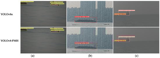 In order to more intuitively highlight the superiority of the algorithm proposed in this article and its performance comparison with other detection algorithms, a visual example of the YOLOv8-PMH algorithm and other existing algorithms is shown in Figure 11.