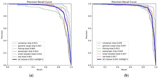 The PR curve is formed by the precision and recall of the model as the coordinate axes. Usually, due to the mutual constraint between precision and recall, the comprehensive performance of the model can be comprehensively understood by observing the enclosing area of the PR curve. In Figure 10, the PR curve of the original YOLOv8 model is shown on the left, and the PR curve of the YOLOv8-PMH model is shown on the right. By comparison, it is evident that the PR curve of the YOLOv8-PMH algorithm has a larger encircling area, especially the green curve about the fishing boat is obviously close to the upper-right corner, and this result intuitively demonstrates that the YOLOv8-PMH algorithm has significantly improved the detection results.