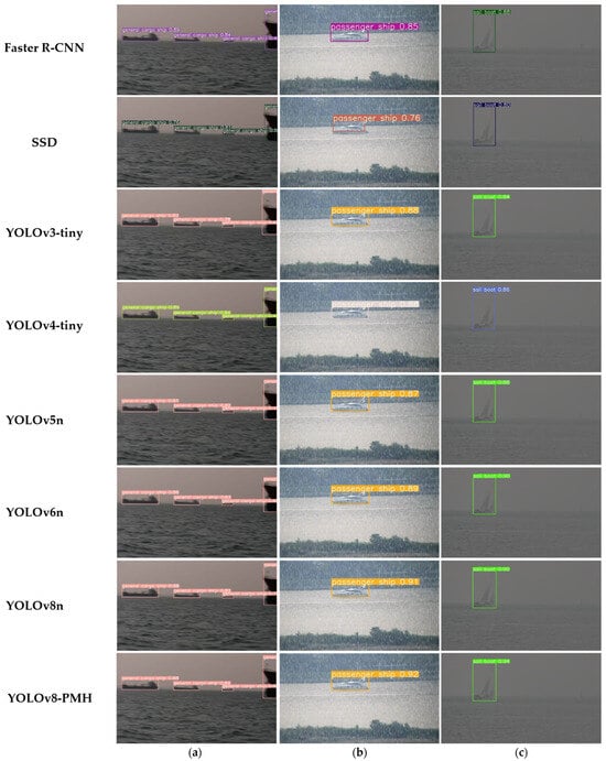 Based on the comparison results of the different models mentioned above, the YOLOv8-PMH algorithm proposed in this study achieves 94.2% for mAP50 and 73.2% for mAP50:95, which collectively shows the best detection performance on the homemade dataset. When detecting large ships, such as container ships and regular cargo ships, the detection performance of each model is quite good. However, for smaller vessels such as fishing boats, passenger ships, and sailboats that are more likely to cause damage to buoys, the YOLOv8-PMH algorithm exhibits superior performance.