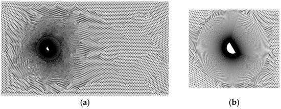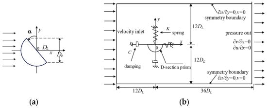 The computational domain setup is illustrated in Figure 1b, with the coordinate origin located at the midpoint of the straight edge of the section, the positive x-axis aligned with the flow direction, and the y-axis perpendicular to the flow. The inlet features a constant uniform flow. The outlet boundary condition is set as a pressure outlet, while the top and bottom boundaries are set as symmetric boundary conditions. The prism surface is designated as a no-slip wall. The total length of the flow computational domain (in the flow direction) is 48, and the total width is 24. The distance from the center of the prism’s straight side to the top and bottom boundaries, as well as the inlet boundary, is 12 each. The blockage ratio, , is less than 5%, suggesting that the effect of the domain’s width on the D-section prism can be neglected [].