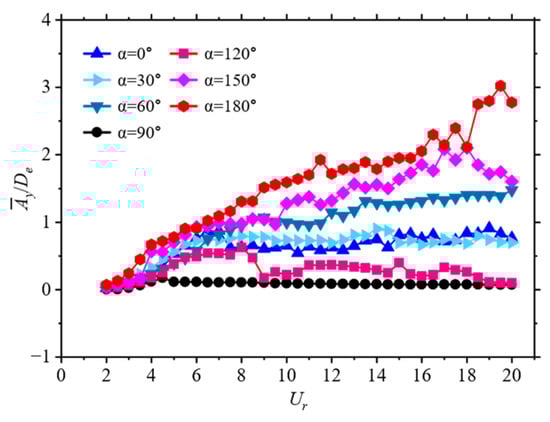Under the influence of water flow, the D-section prism undergoes time-varying displacements, and its equilibrium position of vibration often does not coincide with the initial position. Amplitude is a critical parameter for flow-induced vibration analysis. Figure 3 presents the transverse amplitude of the D-section prism as a function of the reduced velocity under the approach angle , where represents the mean value of the flow-induced vibration amplitude of the prism. Figure 4 illustrates the displacement of the prism’s vibrational equilibrium position (time-averaged) relative to the initial position.