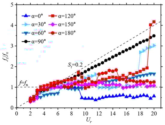The prism has geometrical symmetry in the flow direction at . At lower reduced velocities (), the dimensionless vibration frequency of the prism is very small, and the prism is in the initial branch of VIV. With the increase in the Reynolds number, the prism gradually moves into the upper branch and experiences vortex-induced vibrations, with the amplitude being about 1. The prism is “locked” by the fluid, and its dimensionless frequency is around 1. When the reduced velocity increases to , the dimensionless vibration frequency of the prism drops to around 0.5, entering the fully galloping region with chaotic and irregular amplitudes.