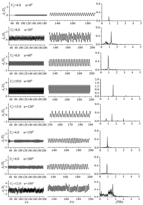 Figure 5 illustrates the variation of dimensionless vibration frequency () of the D-section prism at different angles of attack with respect to Reynolds number. Here, f represents the vibration frequency of the prism, which is obtained by subjecting the time history displacement curve of the prism to fast Fourier transform to extract the dominant frequency. Figure 6 presents the displacement history curves of the prism at different angles of attack, along with their corresponding dimensionless vibration spectra.