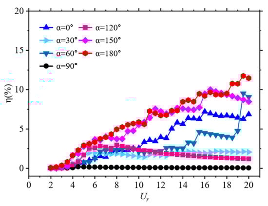 By substituting the non-dimensional amplitude of the prism into Equation (12), the energy conversion efficiency under various operating conditions can be calculated. Figure 7 presents the variation in the energy conversion efficiency of the D-section prism at different flow angles as a function of the reduced velocity.