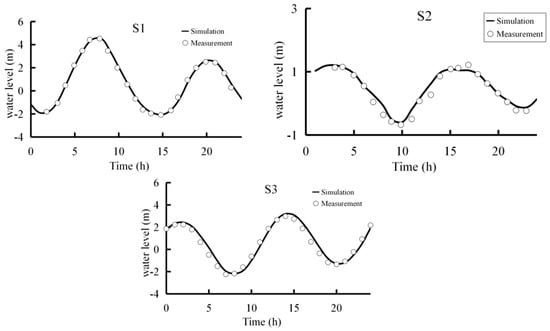 From the overall simulation results in the Figure 2, it can be seen that the RMSE tidal level validations S1, S2, and S3 are 0.13, 0.19, and 0.18 m, respectively, indicating that the established typhoon surge model in this study has a high degree of agreement with actual measurement data and can better reflect the typhoon process; therefore, this model can provide tidal conditions for the study of erosion of S1, S2, and S3 bridge piers under the influence of typhoon surges.