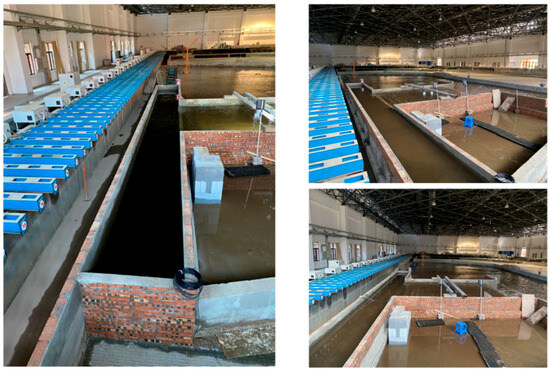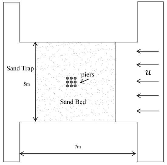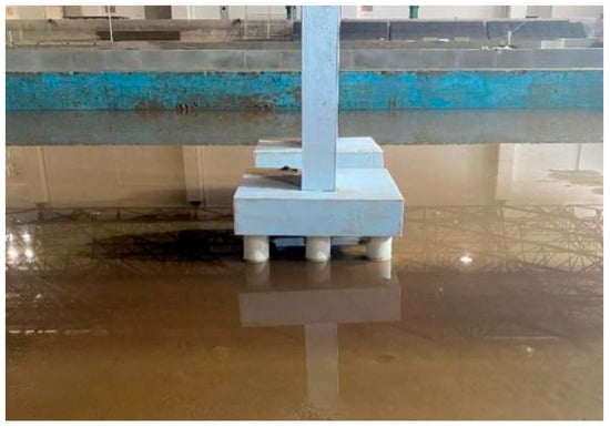 Taking into account factors such as sea depth, extreme flow velocity, model sand selection, bridge pier size, and seawall layout, a large-scale bridge pier scouring test was conducted in the wave tide pool of the Port Engineering Museum at Zhejiang University’s Zhoushan Campus. A 7 m long and 5 m wide wall was built along the north–south direction as the experimental area. We set up a flow-increasing and contraction wall to simulate the scouring of bridge piers under extreme conditions and widened the sedimentation tank to dissipate energy from water flow and settle sediment. The physical model mainly simulates the depth and approximate shape of local scouring pits on bridge piers, and the model can be designed according to normal conditions, that is, the plane scale and vertical scale are consistent. As shown in Figure 3, Figure 4 and Figure 5, the terrain and engineering structure around the bridge piers are scaled according to the drawings to simulate their water-blocking effect, local erosion range, and maximum erosion depth.