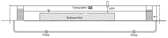 Before the experiment began, an aluminum bracket with a length of 5.5 m was erected between the two walls, and a sliding rail was fixed on the bracket. The ADV was placed on the bracket and slowly filled with water until the required water depth for the experiment was reached, and then the flow rate was gradually increased. At the same time, the tailgate was slowly opened, and the ADV could slide along the rail to measure the flow velocity at each position of the experiment. The underwater terrain measurement instrument using ultrasound was used to detect real-time elevation changes, and the depth of the scouring pit was observed and recorded every 10 to 20 min. When it was observed that the local erosion pit no longer deepened and expanded, the local erosion had reached an equilibrium state. Then, we closed the tailgate and shut down the water pump. After the flow rate dropped to 0, we slowly opened the tailgate to discharge the water from the water tank. We observed the local erosion pattern around the bridge pier after the water in the sink had drained. The observation of the erosion pit morphology used underwater terrain measurement with a range of 0.03 to 40 m, an accuracy of 0.1 mm, and an operating temperature of 0 to 60 degrees, which met the needs of the terrain measurement.