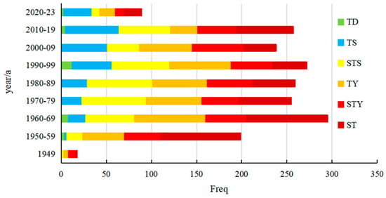 This study collected historical typhoon path datasets provided by the World Meteorological Organization (WMO) and the China Meteorological Administration (CMA) and analyzed that the historical typhoon path data provided by the China Meteorological Administration (CMA) are the most comprehensive and accurate in the Western Pacific region. The histogram of the annual occurrence of typhoons from 1949 to 2023 is shown in Figure 7, based on intergenerational statistics. As shown in Figure 7, since 1949, a total of 1882 tropical cyclones have been recorded in the Western Pacific, including 426 typhoons, 340 severe typhoons, and 442 super typhoons.