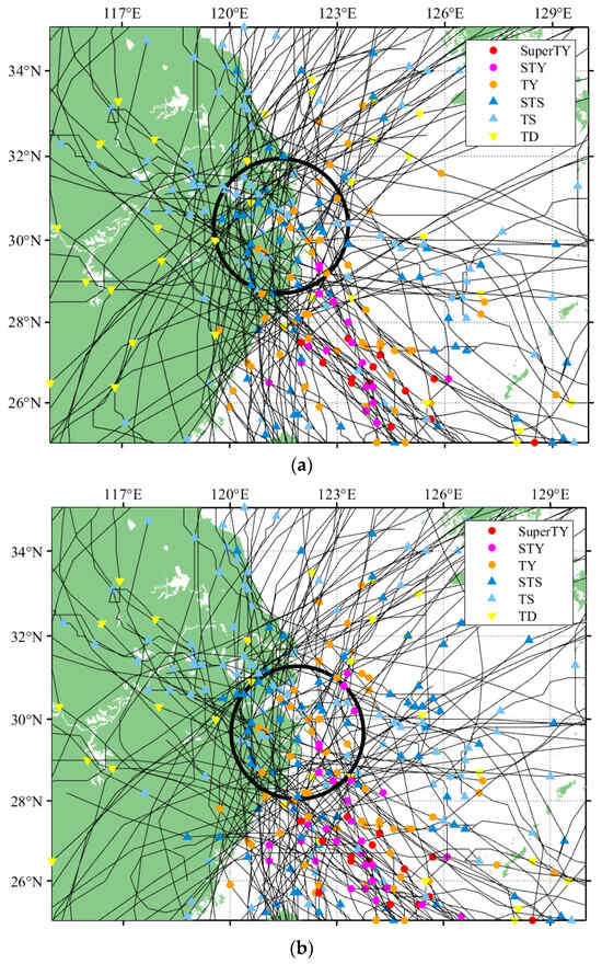 (a) Typhoons in radius of 90 km; (b) typhoons in radius of 180 km.