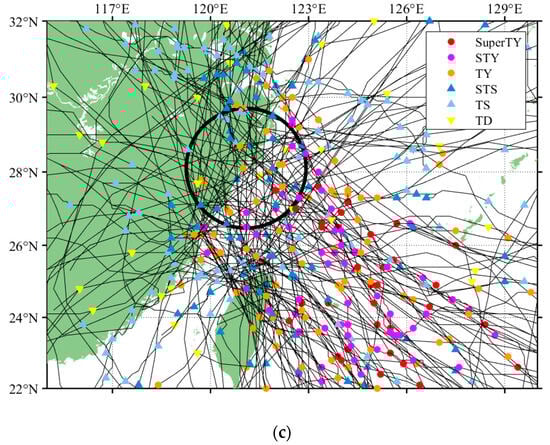 (a) Typhoons within S1 center circle; (b) typhoons within S2 center circle; (c) typhoons within S3 center circle.